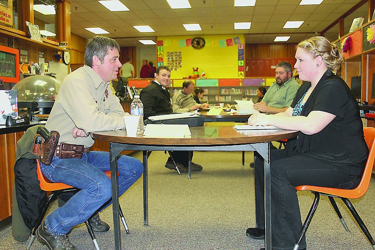 Region One Game Warden Tom Chianelli interviews Plains senior Keely Benson during the JMG Career Fair on Tuesday, Feb. 11.