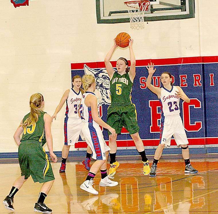 Lady Tiger Gabby Moeller looks for an opening around Superior players Hannah Hollenback, Jordan Mueller and Marissa Koke.