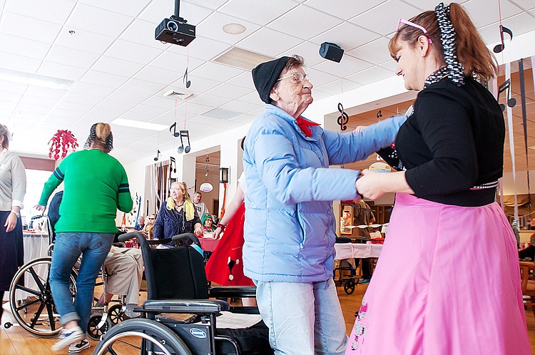 Activities director Roberta Maness, right, dances with resident Verda Johnson Friday afternoon during their first annual Sock Hop dance at Whitefish Care and Rehab. Feb. 14, 2014 in Whitefish, Montana. (Patrick Cote/Daily Inter Lake)