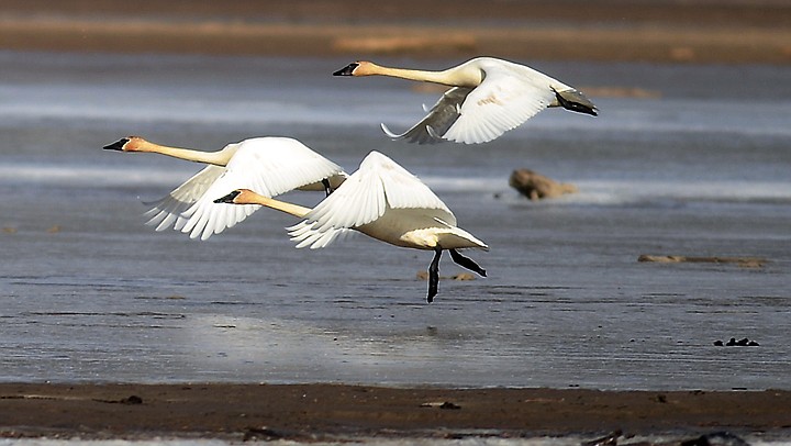 Trumpeter Swans take off from Flathead Lake on Wednesday morning, February 19, near Bigfork. (Brenda Ahearn/Daily Inter Lake)
