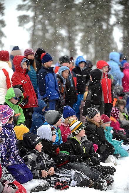 Students from Edgerton Elementary, Swan River School and Muldown Elementary gather around for an ice safety presentation by the Evergreen Fire Department on Thursday, February 20, at Pine Grove Pond north of Kalispell. (Brenda Ahearn/Daily Inter Lake)