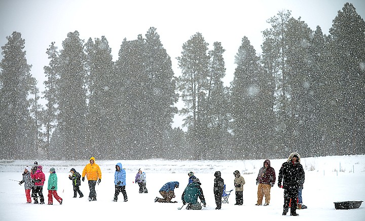 Parents, teachers and students from Edgerton, Swan River and Muldown schools brave a snowstorm Thursday during an ice fishing expedition at Pine Grove Pond.