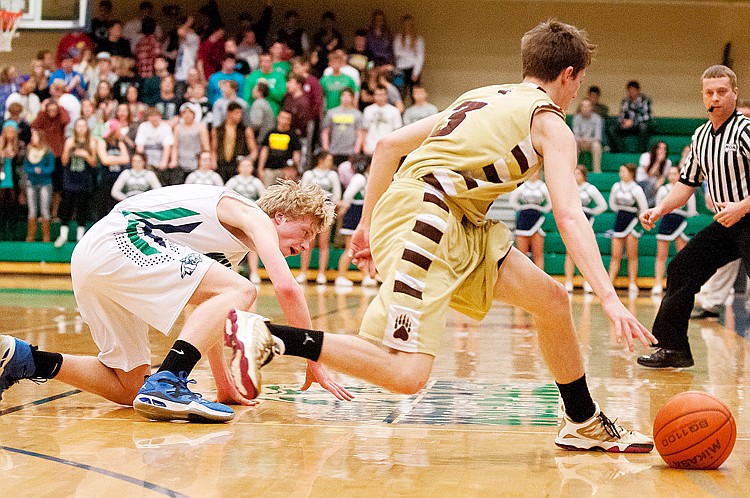 Glacier senior wing Kyler Harkins (left) slips after Helena Capital’s Kyle Nickol (3) steals the ball during Western AA basketball action Friday night at Glacier High School.