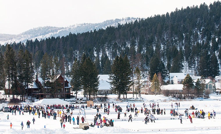 Spectators and competitors cover the ice Saturday afternoon during the Pond Hockey Classic at Foys Lake. Feb. 22, 2014 in Kalispell, Montana. (Patrick Cote/Daily Inter Lake)