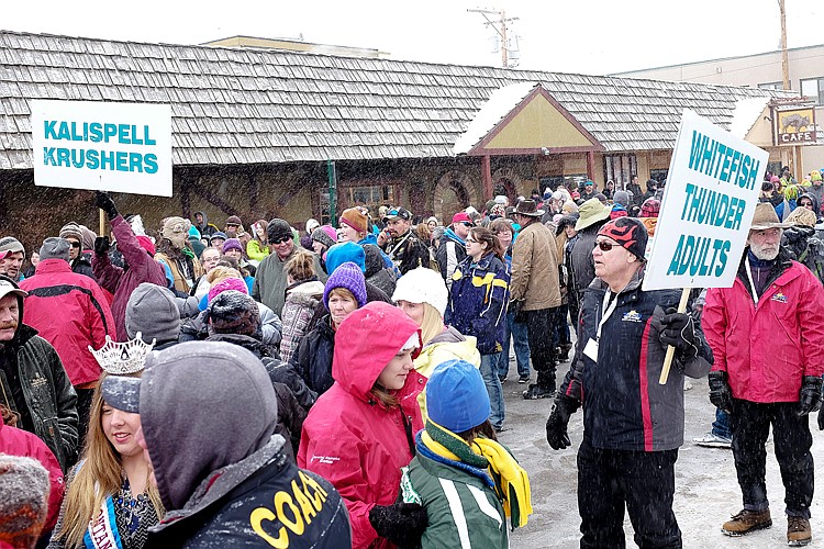 Teams gather on 3rd Street Sunday afternoon before the opening ceremonies parade for Special Olympics in downtown Whitefish. Feb. 23, 2014 in Whitefish, Montana. (Patrick Cote/Daily Inter Lake)
