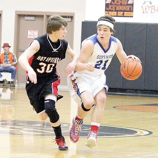 Tanner Smith, guarded closely by Jarod White, rushes the ball past half court in Superior's win over Hot Springs.