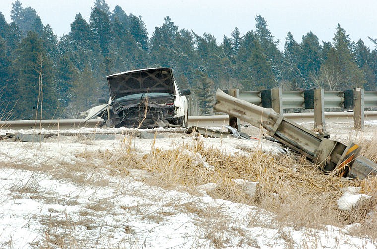 A truck sits in the westbound lane of Montana 82 Thursday after striking a guardrail on the eastbound approach to the Sportsman’s Bridge.