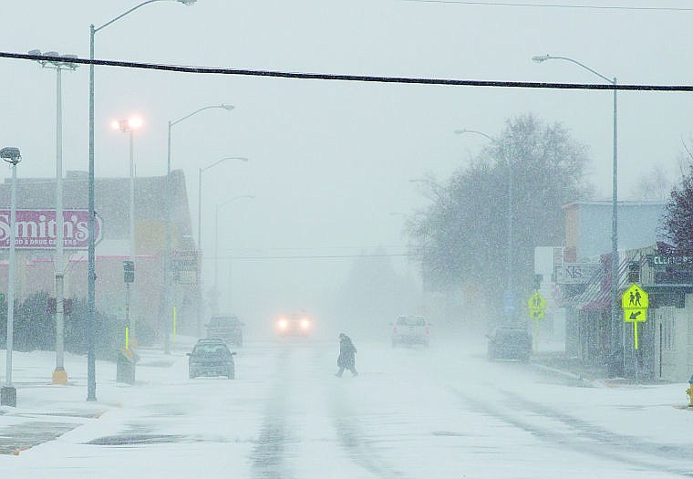 A woman crosses Nucleus Avenue in Columbia Falls during a snowstorm Friday morning. Columbia Falls schools closed Friday due to the weather.