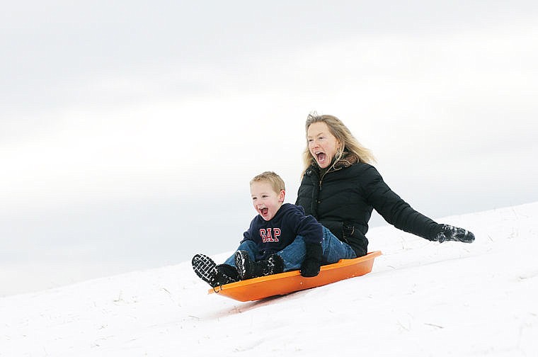 Jasper Bench, 3, sleds with his grandmother Terri McAllister Thursday afternoon at Kidsports Complex in north Kalispell. Jan. 2, 2014 in Kalispell, Montana. (Patrick Cote/Daily Inter Lake)