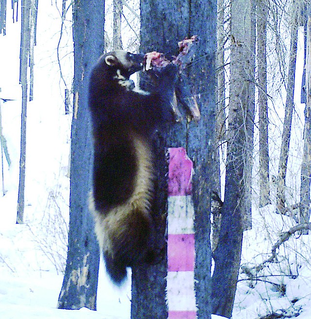 This undated image from a trail camera released by the Bitterroot National Forest shows a wolverine feasting on the leg of a road-killed deer nailed to a tree.