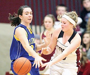 Junior Taylor Brown passes around Libby's Shyla Stevenson to Makaylin Randall second quarter vs. Libby 1-4-14.
