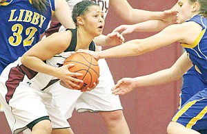 Libby's Devon Gallagher tries to wrest the ball from Troy's Olivia Roach in first quarter action 1-4-14