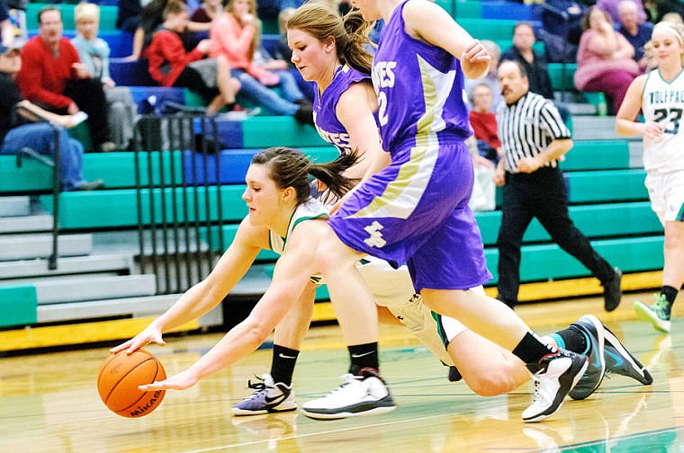 Glacier senior Cassi Hashley (21) goes for a loose ball Tuesday night during Glacier's home victory over Polson. Jan. 7, 2014 in Kalispell, Montana. (Patrick Cote/Daily Inter Lake)