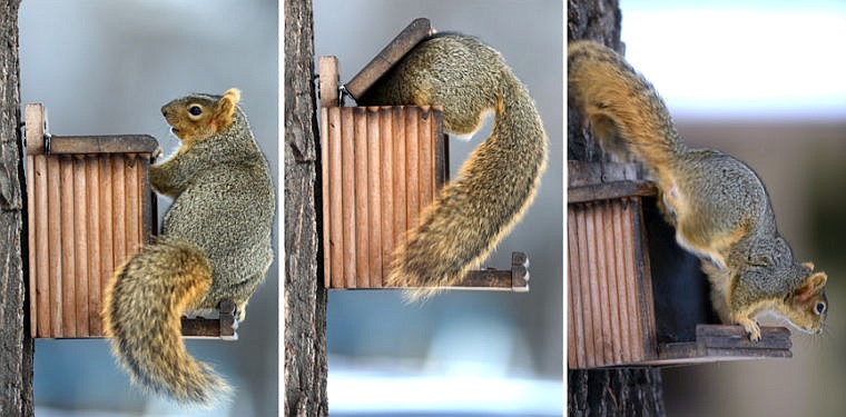 A squirrel grabs lunch on the go from a feeder in downtown Kalispell on Thursday.