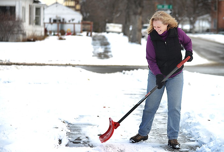 Eileen Lowery of Kalispell clears snow from her sidewalks on Thursday afternoon, January 9. (Brenda Ahearn/Daily Inter Lake)