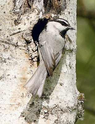 Mountain chickadees are similar to the black-capped chickadees except they have a white stripe above their eyes within the black cap.