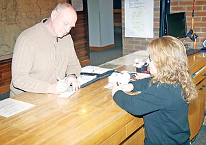 Russell F. Bache, 62, is assisted by Deputy Clerk Robin Benson on Thursday as he filed to run for Lincoln County commissioner. Bache was among those to complete paperwork Thursday, the first day to so for a Lincoln County position. Bache, a retired chief petty officer in the U.S. Navy, served in the military for 28 years. Bache is running for Libby commissioner, a position currently held by Tony Berget. Others filing Thursday include Tammy Lauer for clerk and recorder, elections administrator, surveyor, assessor and auditor; Roby Bowe for sheriff; Mark Peck for commissioner; Bernie Cassidy for county attorney; and Jay Sheffield for justice of the peace. Candidates seeking office have until March 10 to file for the Nov. 4 election.