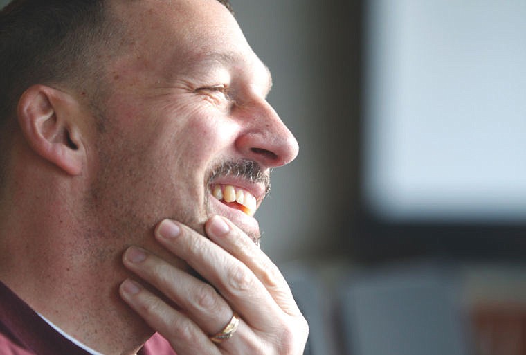 KXDD DJ Joel Baker cracks a smile while talking about his childhood interest in being a radio DJ on Dec. 31. (Andy Sawyer photo/Yakima Herald-Republic)