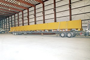 Fisher Industries workers on Monday were securing the steel cranes to a stretch-deck flatbed trailer inside the Stinger building. There were no overhead structures spanning the massive ceiling of the building.