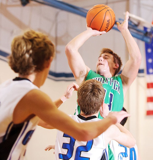 Glacier junior Tucker Rauthe shoots over Stillwater Christian defenders Tuesday night during Stillwater Christian's matchup against Glacier junior varsity at Stillwater Christian School. Jan. 14, 2014 in Kalispell, Montana. (Patrick Cote/Daily Inter Lake)