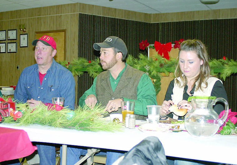 Kyle and Whitney Johnson share a conversation with Plains Volunteer Fire Department Chief Joe Sheppard at the fire department Christmas party.