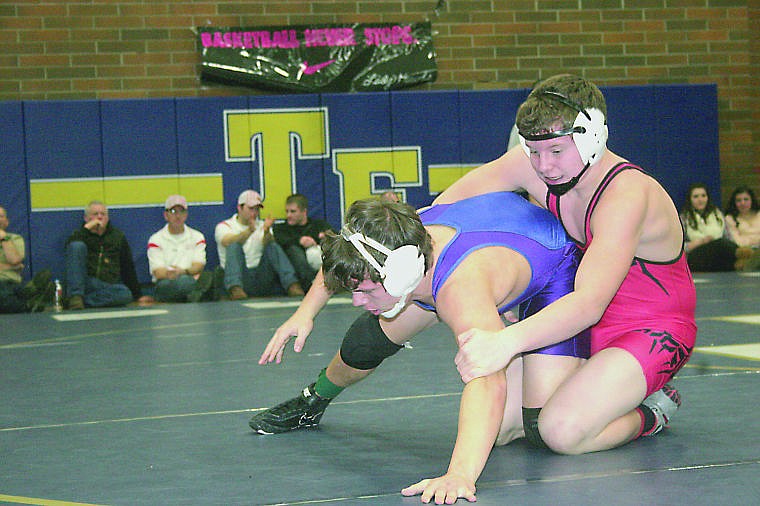 Noxon wrestler Luke Crowe takes on his opponent during the Saturday tournament in Thompson Falls. Crowe came in second place in his class.