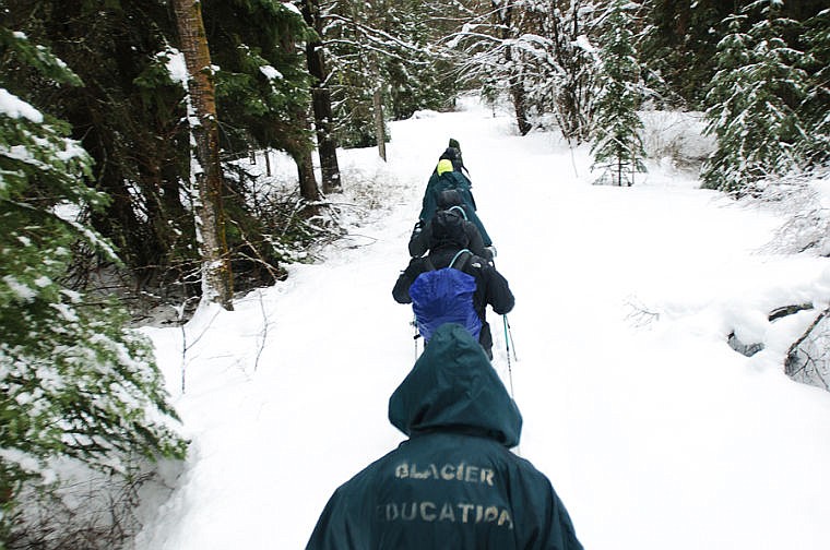 Hikers walk along Ox-Bow Trail Saturday during a guided snowshoe hike from the Apgar Visitors Center in Glacier National Park. Jan. 11, 2014 in Glacier National Park, Montana. (Patrick Cote/Daily Inter Lake)