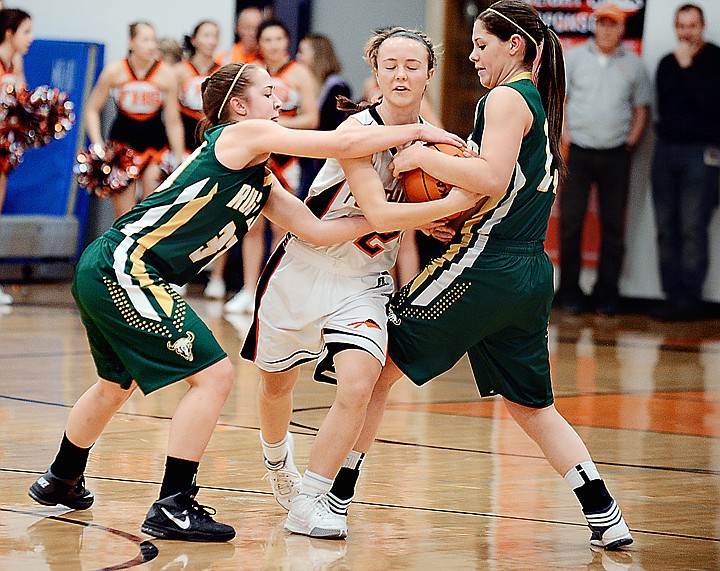 Flathead sophomore Stephanie Wilson (12) fights for a jump ball during the game against CMR on Saturday, January 18, in Kalispell. (Brenda Ahearn/Daily Inter Lake)