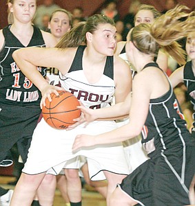 Lindsay Laws steals the ball from Kaitlyn Downey in first quarter vs. Troy, Jan. 2.