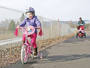 Keela Lacefield, 3, leads the way followed closely by her mother Janelle and Kenna, 1, Wednesday afternoon on the path behind the mill. There were quite a few people out taking advantage of the unusually warm temps for mid January.