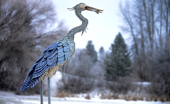 A layer of light frost coats the Great Blue Heron statue in River Trail Park on January 21, in Whitefish. The statue, created by artist Jim Dolan, is dedicated: To the people of Whitefish in memory of Chet, Carol and Jared Hope. (Brenda Ahearn/Daily Inter Lake)