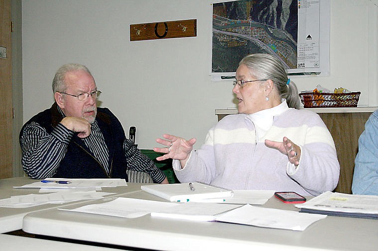 Mary Jo Berry presents an update to Monte Turner, the new co-president of the Mineral County Chamber of Commerce, during the chamber's monthly meeting.