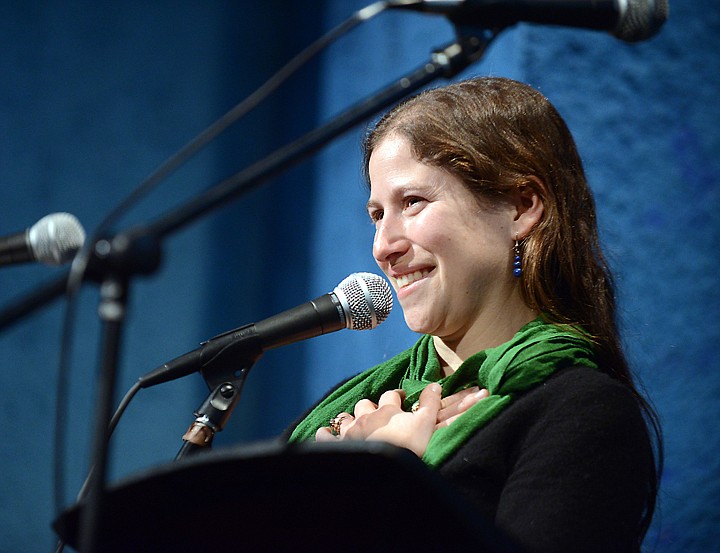 Hilary Shaw, executive director of the Abbie Shelter, reacts as the shelter is named the first recipient of the Peace Quilt Award on Tuesday, January 21, at Flathead High School in Kalispell. (Brenda Ahearn/Daily Inter Lake)