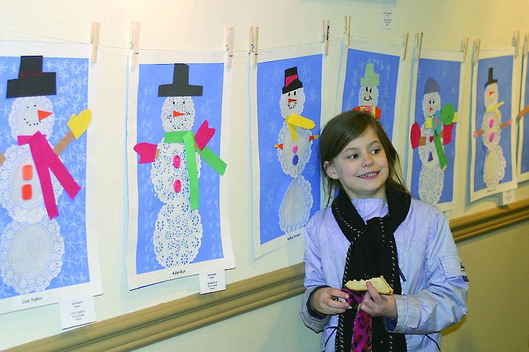 First grader RuBea Privett poses next to her snowman illustration in the middle of the Art on the Walls Student Show.