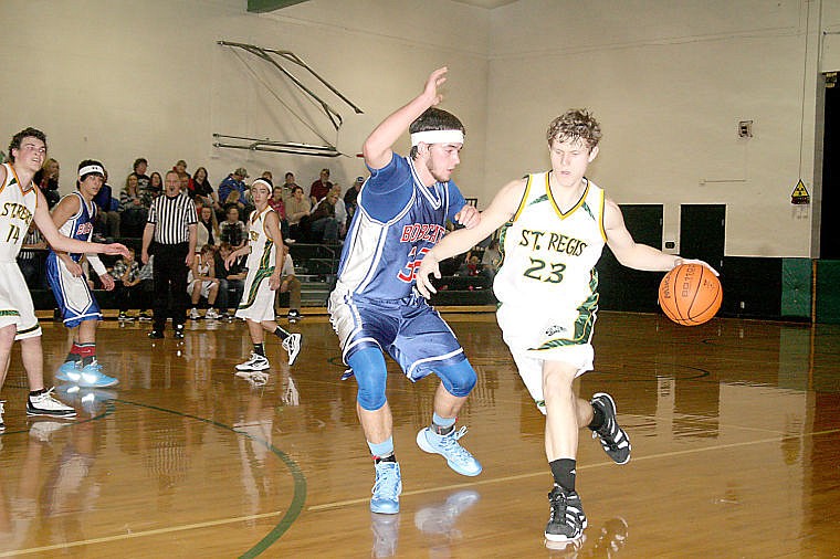 Superior junior Wyatt Zylawy attempts to block junior Gibson Lowry, of St. Regis, during the rivalry game Tuesday in St. Regis.