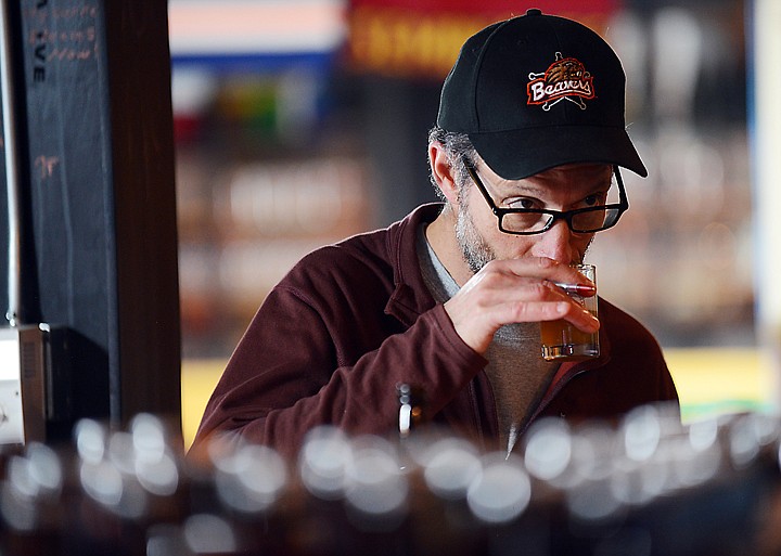 Ron Behrendt of Whitefish and others gather at the Great Northern Brewery on Wednesday evening, January 22, to taste the various beers created using locally grown hops. Beers were scored using the Hop Union Aroma Wheel, general impressions were also recorded. (Brenda Ahearn/Daily Inter Lake)