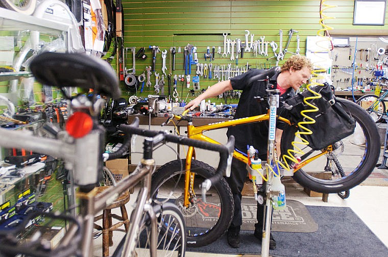 Wheaton's Cycle mechanic Mark Christensen tunes up a winter touring bike Thursday afternoon at the Kalispell bicycle shop. Jan. 23, 2014 in Kalispell, Montana. (Patrick Cote/Daily Inter Lake)