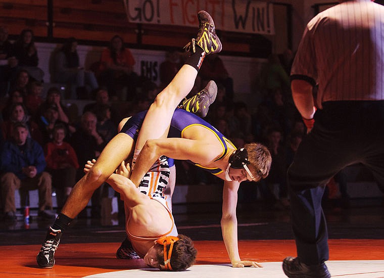 Flathead 160-pound wrestler Anthony Wright (bottom) fights for position against Missoula Big Sky's Jason Riekena Tuesday night during Flathead's loss to Big Sky. Jan. 28, 2014 in Kalispell, Montana. (Patrick Cote/Daily Inter Lake)