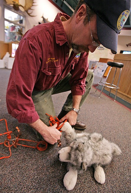 Bob Hunter, hunter education coordinator for ADFG in Fairbanks, starred in the videos. Hunter used his daughter's stuffed husky as a dummy in the videos and the traps he used were painted blaze orange for better visibility.