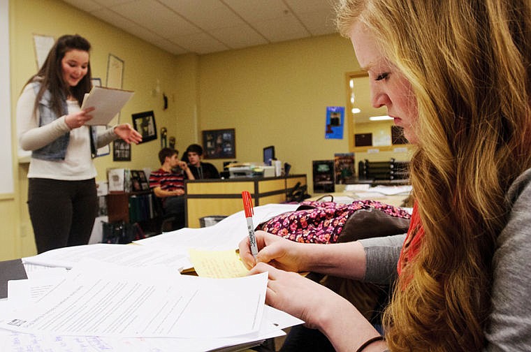 Kyersten Siebenaler takes notes while Josie Jolly makes a Legislative Debate presentation Tuesday evening during speech and debate practice at Glacier High School. (Patrick Cote/Daily Inter Lake)