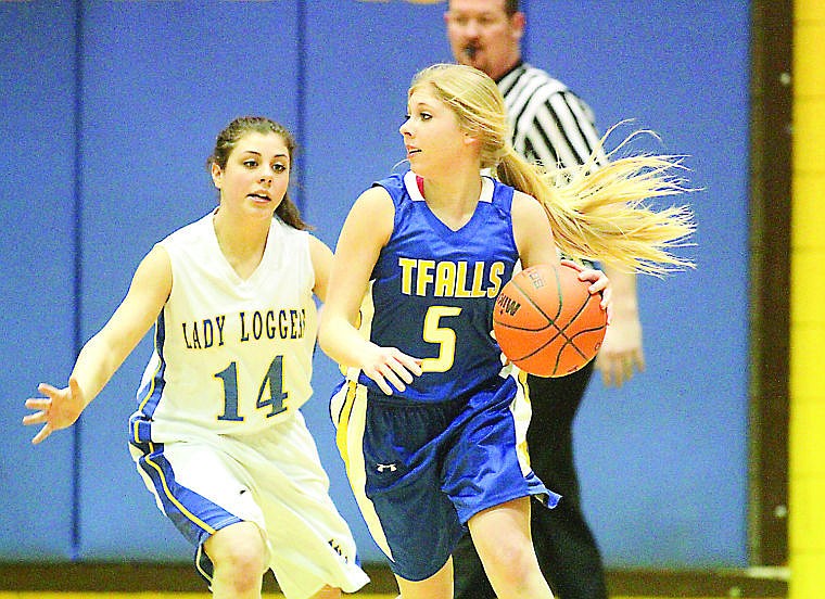 Erica Sorlie looks for a Lady Hawk as she makes her way down the court in Libby.