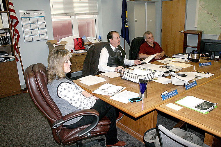 Mineral County Commissioners Laurie Johnston, Roman Zylawy and Duane Simons discuss the differences in maps of the Lookout Pass Ski Resort expansion at their weekly meeting.