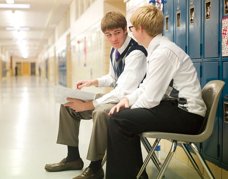 Columbia Falls High School students Mason Gedlaman, left, and Henry Chisholm get ready for their Impromptu Speaking round during the Columbia Falls Invitational in November. Gedlaman is a defending state speech champion.