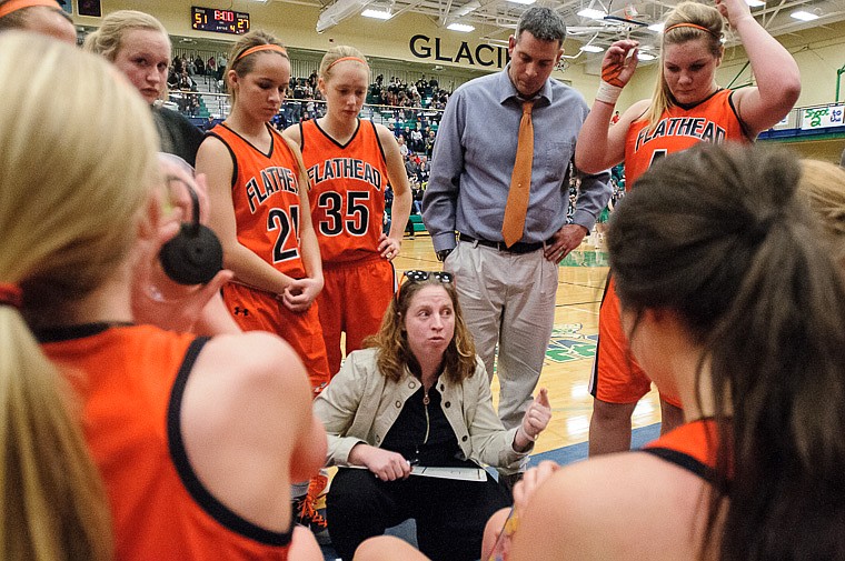 Flathead head coach Lisa Hendrickson talks to her team during the second half of Glacier's crosstown victory over Flathead at Glacier High School in this 2014 file photo. (Patrick Cote/Daily Inter Lake)