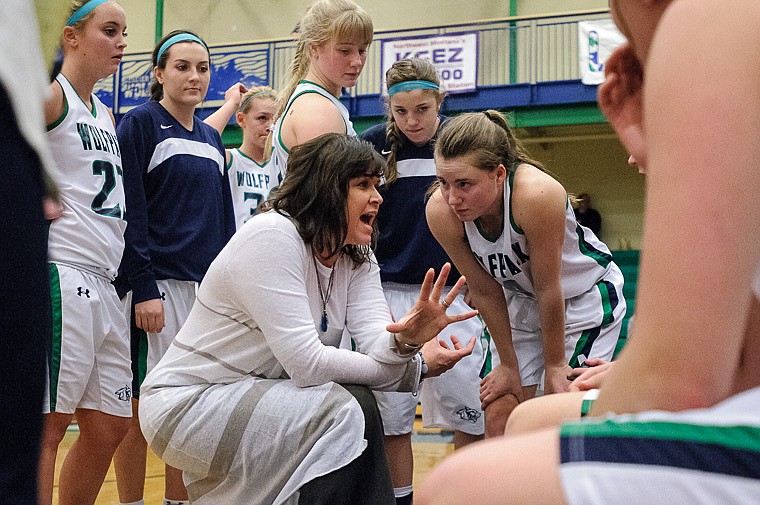 Glacier head coach Kris Salonen talks to her team during the second half of Glacier's crosstown victory over Flathead at Glacier High School. on Jan. 30, 2014. (Patrick Cote/Daily Inter Lake)