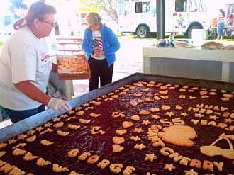 The pie is more like a cobbler. There is no bottom crust, and the top crust is made in pieces that spell out a message. After Joe Schons and Hector Saldana prepare the giant pie pan, the Georgettes pour in the filling and affix the top crust.