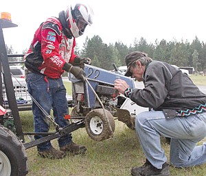 Royce Pemberton, left, and pit crew member Dale VanDenbos remove a bent tie rod from the 16 hp racing lawnmower.