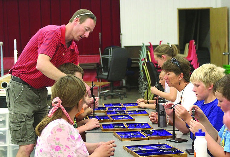 Hot Springs Superintendent Kevin Meredith lends a helping hand as students work on tying their handmade fly lures at the Hot Springs fly fishing camp last week.