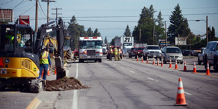 Southbound traffic is diverted around a gas main incident on Wednesday morning in Evergreen on U.S. 2. (Brenda Ahearn/Daily Inter Lake)
