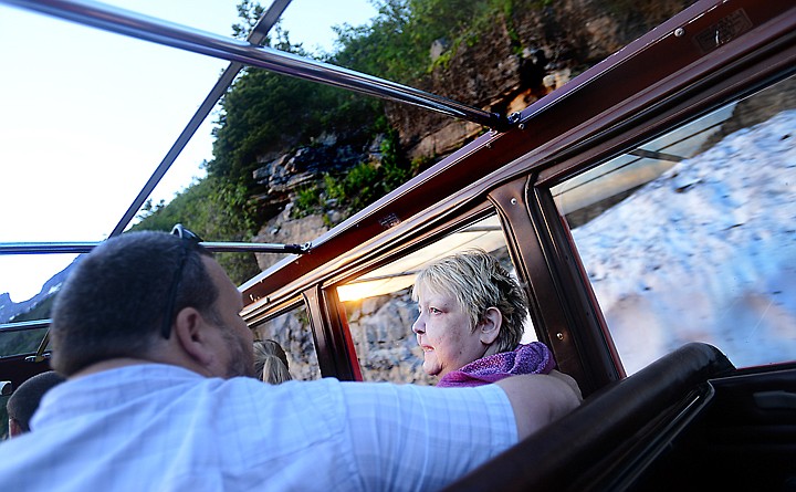Rhonda Hendricks shares a word with her husband, Doug, as the red bus makes its way down from Logan Pass at sunset on Wednesday in Glacier National Park.